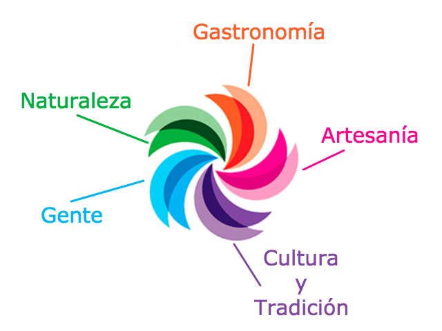 El morado es la cultura y tradición; el azul simboliza a la gente; el verde a la naturaleza; el naranja a la gastronomía típica y el rosa mexicano a las artesanías únicas del lugar.