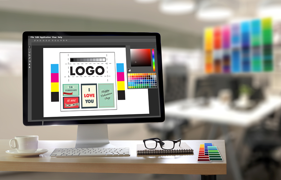 Creative Designer Graphic at work. Color swatch samples Illustrator Graphic designer working digital tablet and computer